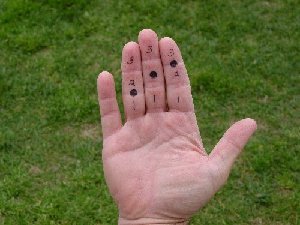 touch the base of the little finger and rest just above the first joint of the