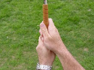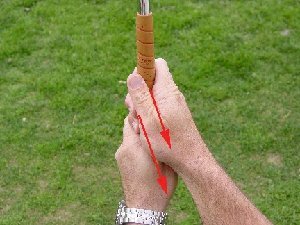 the club at an angle and in the fingers, place your left thumb (for